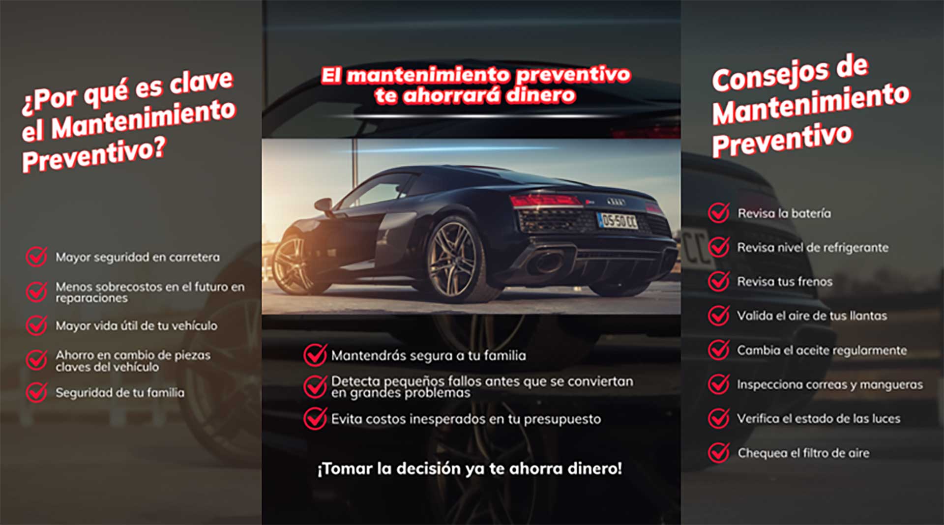Tu tranquilidad al volante no es negociable. ¿Sabías que muchos incidentes en carretera se pueden evitar con una revisión oportuna? Nuestro servicio estrella del mes, el Mantenimiento Preventivo, está diseñado para garantizar que cada viaje con tu familia sea seguro. Calidad técnica y resultados reales para mantener tu auto como nuevo.
